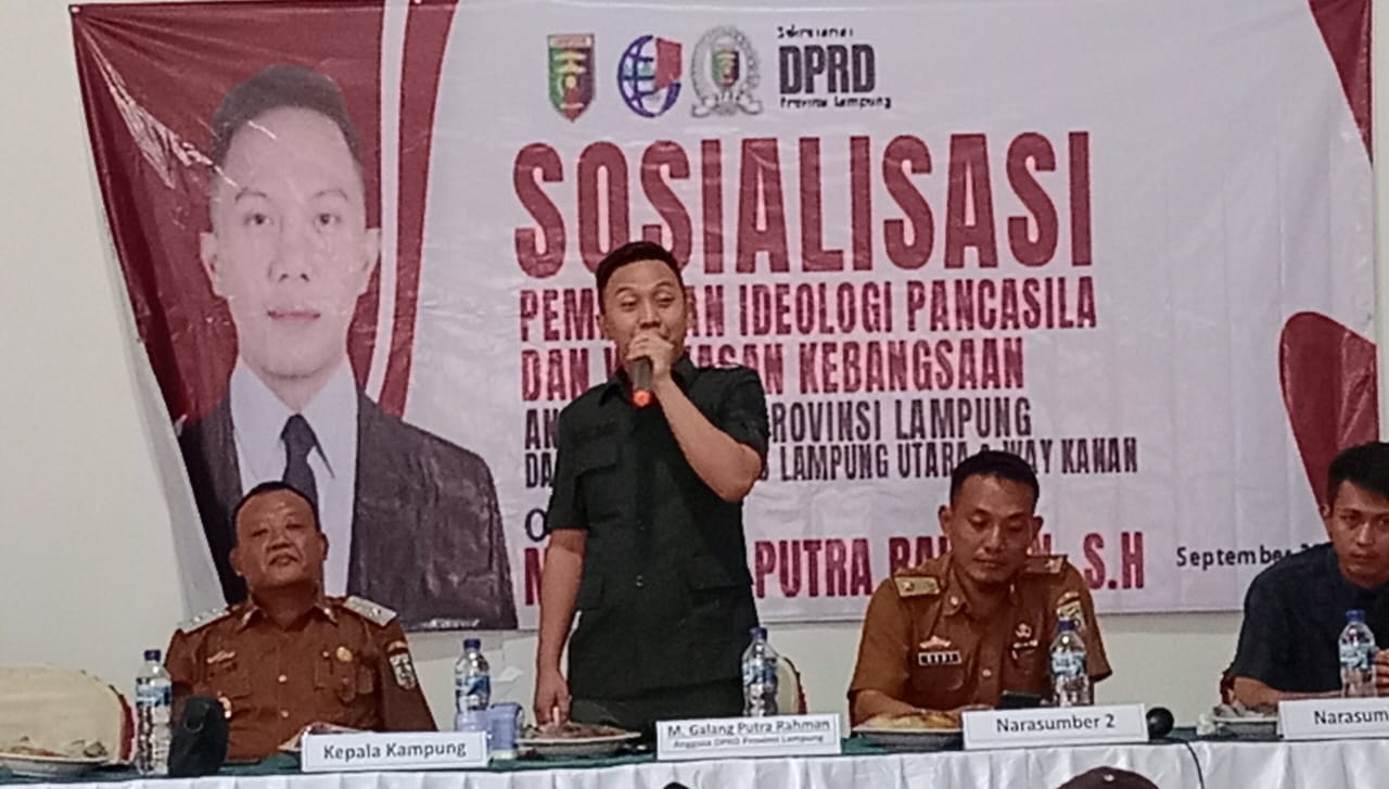 Way Kanan – Sosialisasi Pembinaan Ideologi Pancasila dan Wawasan Kebangsaan oleh Galang Putra Rahman yang saat ini sebagai Anggota DPRD Provinsi Lampung daerah pemilihan 5 Lampung Utara dan Way Kanan dari Partai Gerindra yang bertempat di Balai Kampung Tanjung Dalam, Kecamatan Bumi Agung, Kabupaten Way Kanan, Lampung, Selasa 24/09/2024
