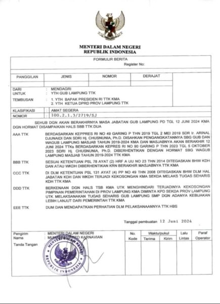 Bandar Lampung – Beragam respon dari fraksi DPRD Provinsi Lampung atas terbitnya Surat Keputusan Kemendagri tertanggal 12 Juni 2024, tentang Pelaksana Harian Gubernur Lampung, yang menunjuk Sekdaprov Lampung, Fahrizal Darminto.