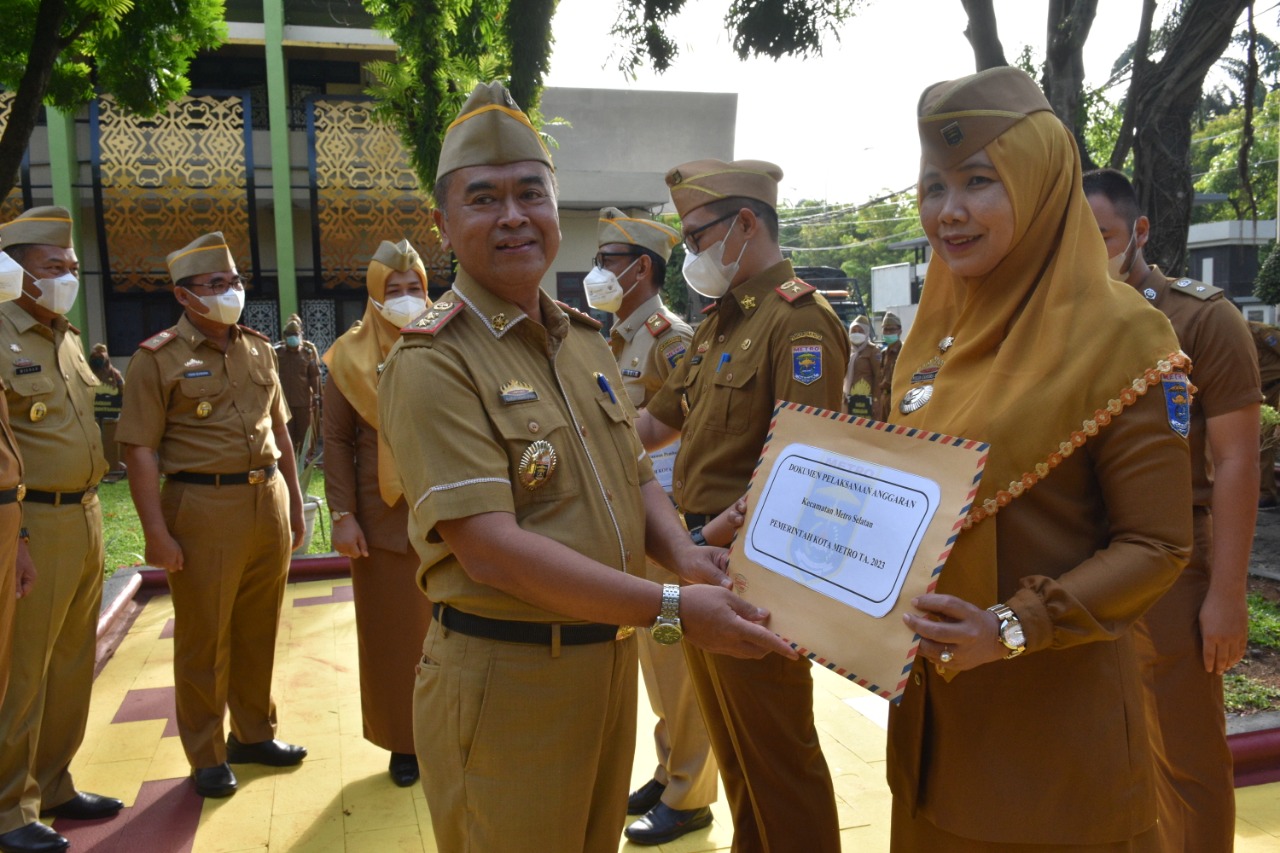 Kota Metro – Pemerintah Kota Metro melalui Sekertaris Daerah (Sekda) Kota Metro Bangkit Haryo Utomo menyerahkan Dokumen Pelaksanaan Anggaran (DPA) Tahun 2023 kepada Organisasi Perangkat Daerah (OPD) yang di Halaman Kantor Walikota Metro saat Apel Mingguan, Senin (09/01/2023).