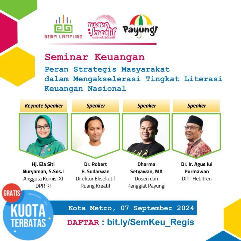 Dalam seminar keuangan ini, dihadiri oleh Anggota Komisi XI DPR RI Hj. Ela Nuryamah, S.Sos.I sebagai keynote speaker. Selain itu juga hadir Faunder Payungi dan Dosen IAIN Metro Dharma Setyawan, MA, Direktur Eksekutif Ruang Kreatif Dr. Robert E. Sudarwan, dan DPP Hebitren Dr. Ir. Agus Jui Purmawan sebagai speaker.