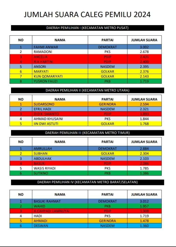 Berikut perolehan jumlah suara partai dan Caleg yang diprediksi meraih kursi DPRD Kota Metro 2024-2029: