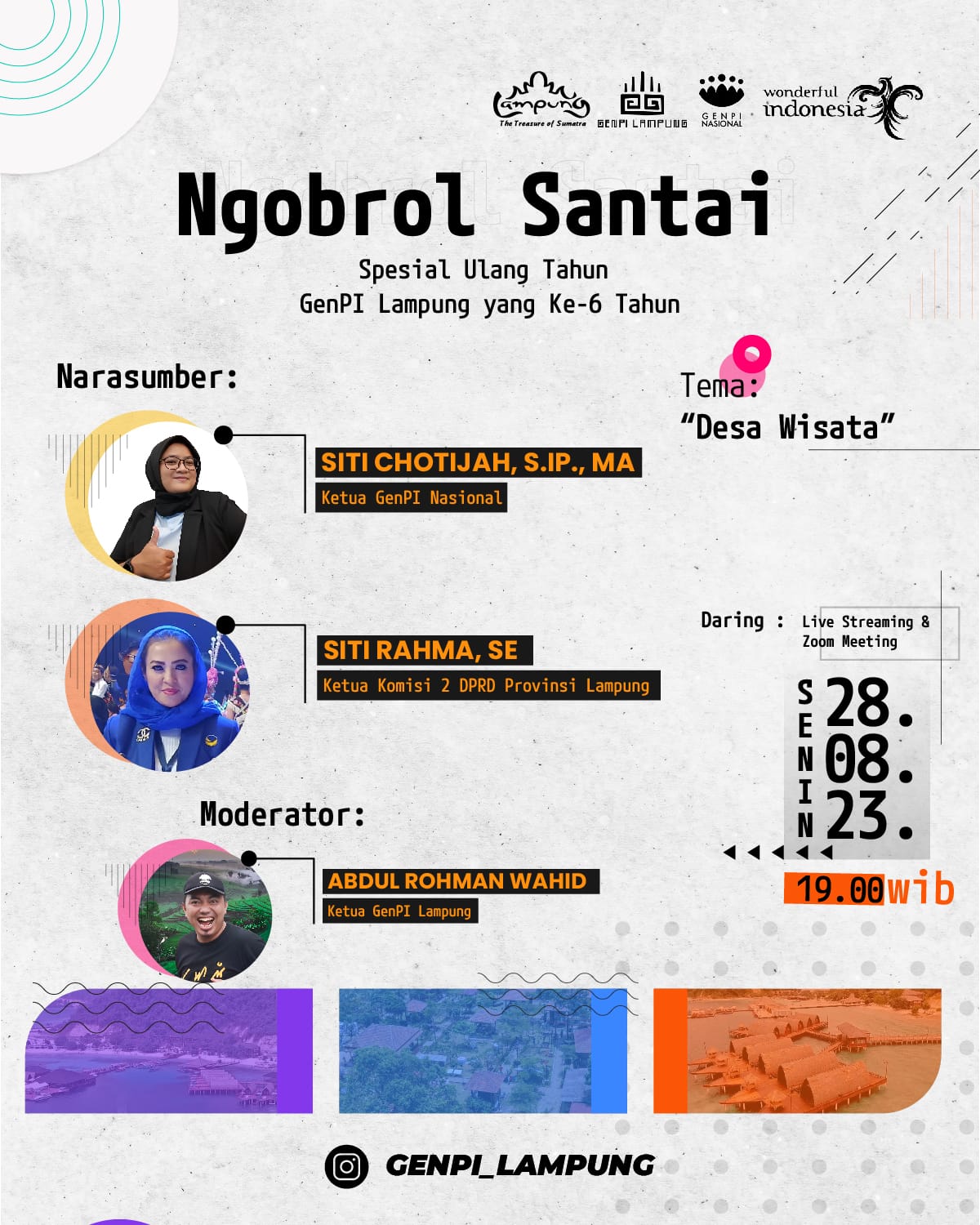 Ketua Umum GenPI Lampung saapan Kak Wahid menjelaskan, kegiatan diskusi secara online melalui Live Streaming dan Zoom Meeting Anniversary GenPI Lampung ke-6 ini mengusung tema “Desa Wista”.